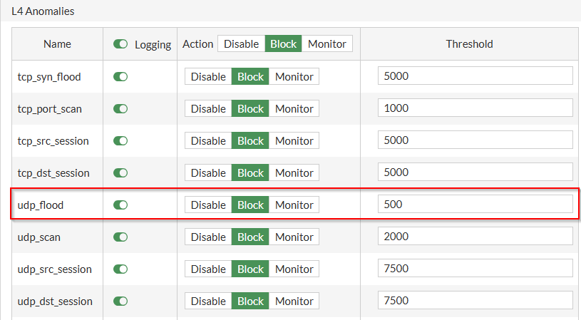 Recomendación: Evalúa si hay tráfico desde Internet hacia servicios internos. Si es así, configura políticas DoS con controles básicos sobre SYN flood, UDP floods y escaneos.