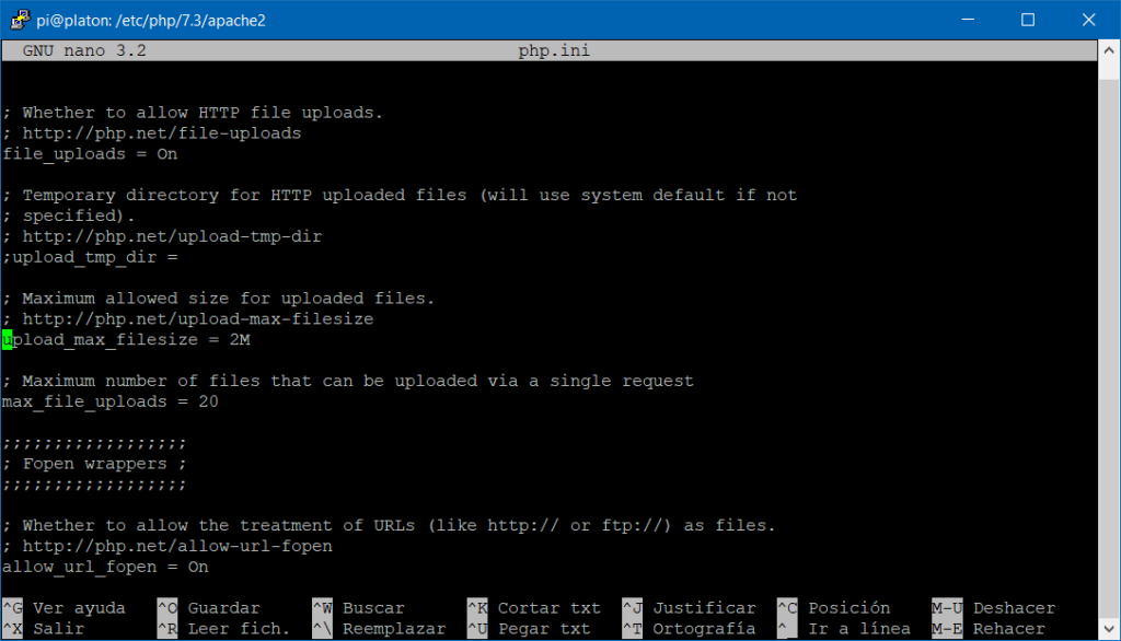 En este caso, la ruta de nuestro fichero php.ini se encuentra dentro de la carpeta etc/php/7.3/apache2/. Tener en cuenta que la ruta puede variar dependiendo de la versión PHP instalada en nuestro equipo por lo que deberemos asegurarnos navegando mediante el terminal.