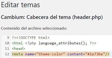 Cambiar el color de la barra de nuestra web será tan sencillo como introducir la siguiente línea de código en el fichero: /wp-content/themes/mitheme/header.php