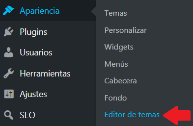 Encontrar este fichero desde nuestro dashboard de WordPress es muy simple. Únicamente debemos ir a la opción Apariencia y hacemos click en Editor de temas.