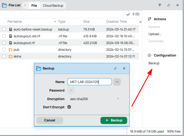 - Haz clic en Backup, asigna un nombre al archivo y presiona OK.