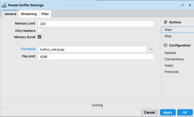 file-name: nombre del archivo.pcapque se guardará en el almacenamiento local del router.file-limit: tamaño máximo del archivo (en este caso, 1 MB).filter-interface: interfaz donde se capturará el tráfico (puedes usarall).filter-ip-addressyfilter-port: opcionales, para filtrar tráfico específico.
