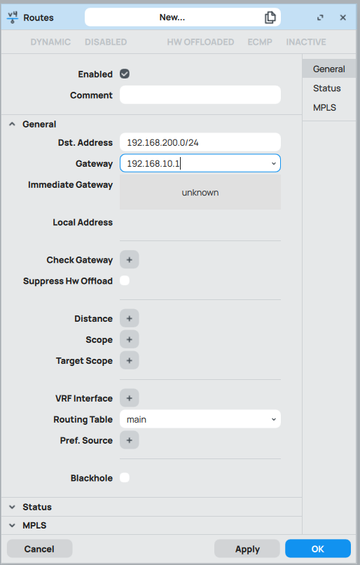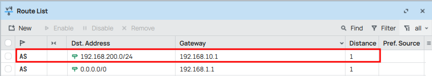 Este comando indica al MikroTik que todo el tráfico destinado a la red 192.168.200.0/24 debe salir por la IP 192.168.10.1.