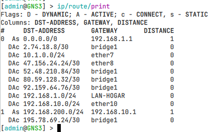 /ip route add dst-address=192.168.200.0/24 gateway=192.168.10.2 distance=2Esto sirve para crear una ruta secundaria en caso de fallo. - Para ver solo las rutas estáticas (no generadas dinámicamente):