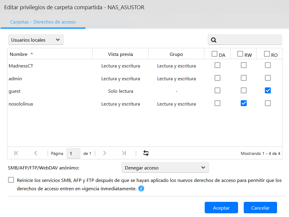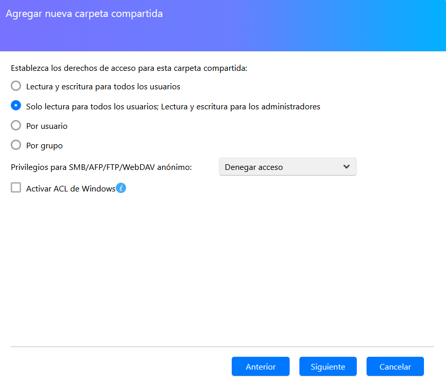 - Selecciona los derechos de acceso a la carpeta, en este paso solo para usuarios administrador.