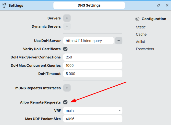 Settings, asegúrate de que la opciónAllow Remote Requestsesté habilitada (esto permite que el MikroTik actúe como servidor DNS).
