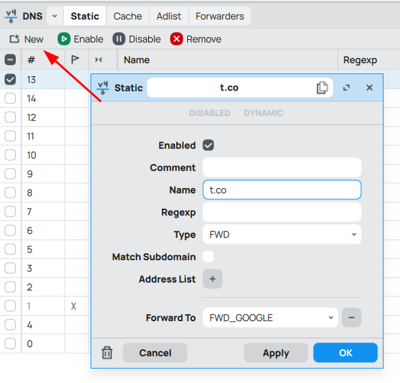 Ahora, debes crear una regla estática para que las consultas del dominio específico se redirijan al servidor DNS configurado en el forwarder.
