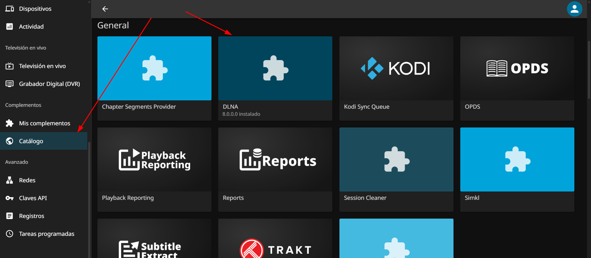 Para instalar el plugin de DLNA necesitamos ir al «Panel de control» y después buscar el complemento: