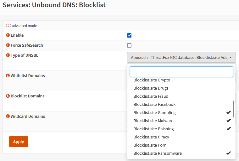 Para bloquear dominios no deseados (como dominios maliciosos), puedes configurar listas de bloqueo en Unbound DNS, usando el blocklist que ya viene instalado por defecto en las versiones recientes de OPNsense: