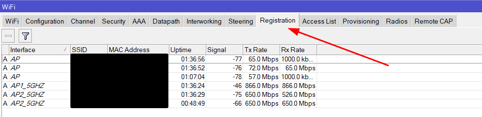 Para ver los clientes que hay conectados desde la controladora podemos visualizarlos desde la pestaña «Registration«: