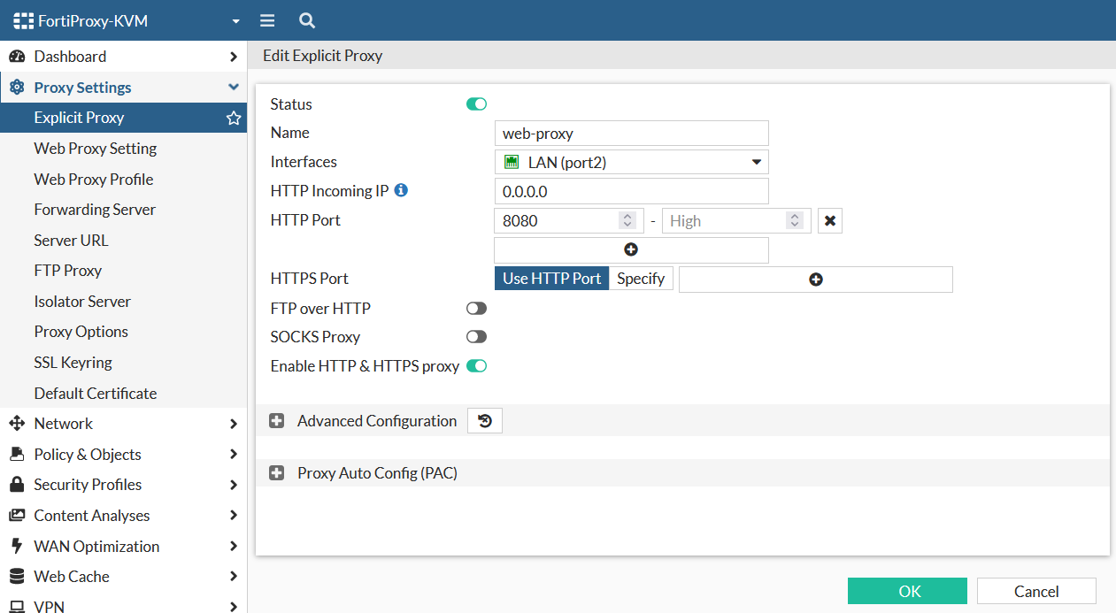 - Los clientes deben configurar manualmente sus navegadores web o aplicaciones para utilizar el FortiProxy como su servidor proxy.