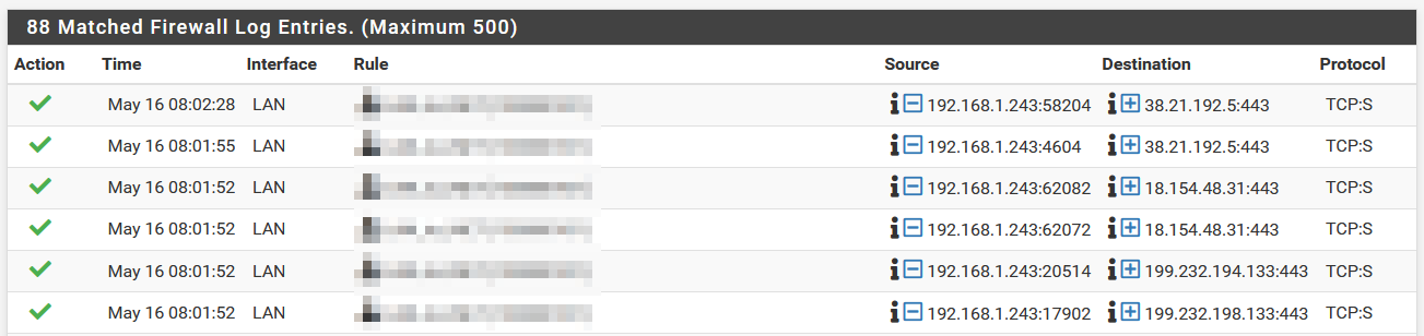 Si a continuación probamos a navegar con este equipo lo estaremos haciendo mediante el proxy. El default gateway de este FortiProxy es un Pfsense y en los logs podemos observar las peticiones HTTPS del cliente Windows10:
