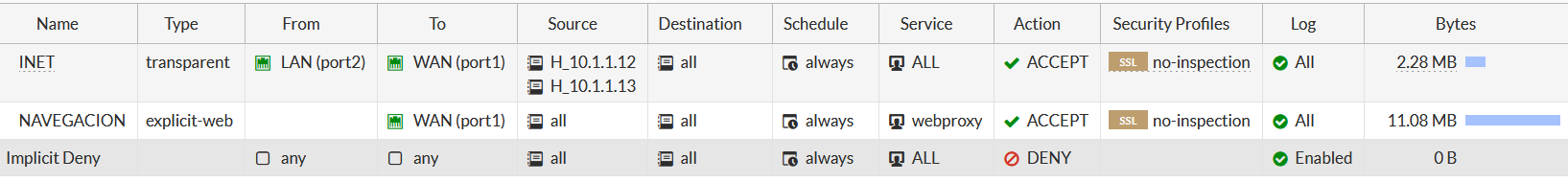 Crearemos las reglas que nos permitan la navegación. Probaremos una regla de tipo transparente y otra explicita. En las reglas explicitas los clientes deberán configurar manualmente la IP del proxy y el puerto, para las reglas transparentes los clientes no deberán realizar ninguna configuración adicional pero su default gateway deberá ser el FortiProxy: