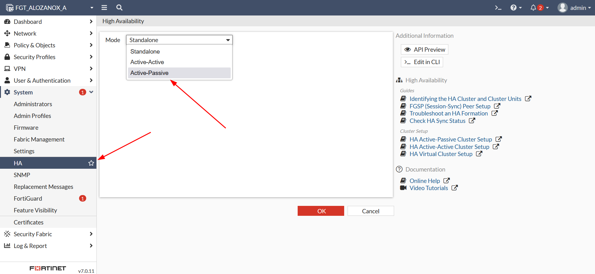 Para configurar un HA en FortiGate deberemos dirigirnos a la sección «System»>»HA». En este ejemplo configuraremos un HA activo-pasivo: