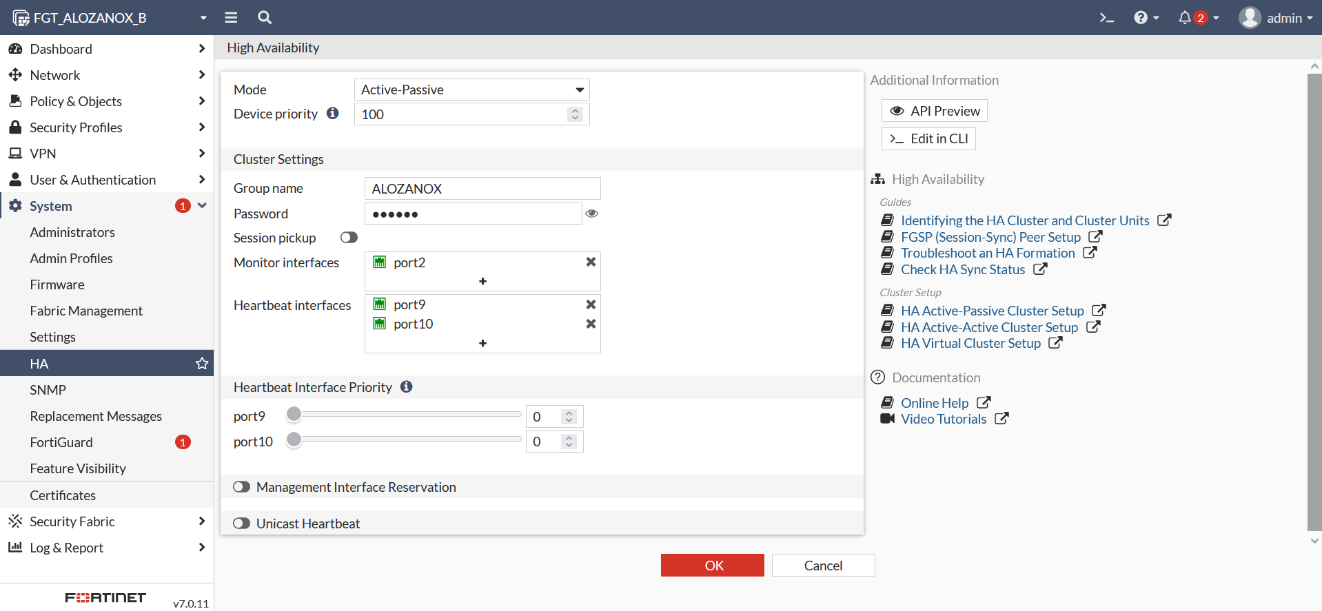 Indicamos un nombre para el grupo HA, la prioridad del nodo, los interfaces de Heartbeat y los interfaces que queramos monitorizar en caso de failover, es decir, en este caso monitorizaremos el port2, de tal manera que si en alguno de los nodos ese enlace se cae el otro nodo tomará el rol de primario automáticamente.