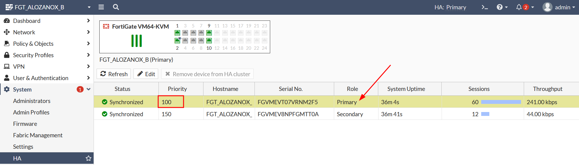 Y ya estaría todo, en este momento ya está formado el HA entre los FortiGates, siendo el nodo-A el primario por tener mayor prioridad: