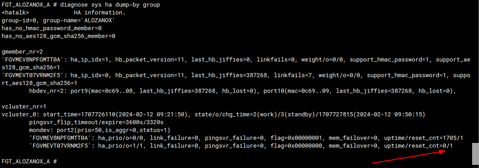 <2024/02/12 09:21:50> FGVMEVT07VRNM2F5 is selected as the primary because the value 0 of link-failure + pingsvr-failure is less than peer member FGVMEV8NPFGMTT0A.