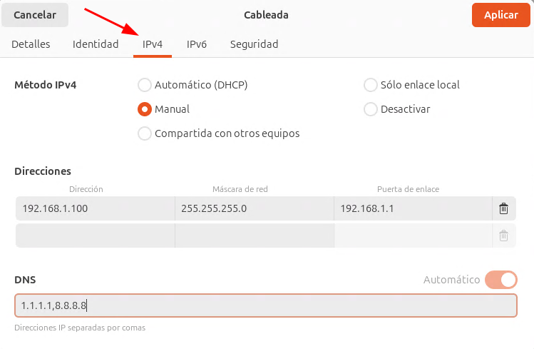 - Ve a la pestaña «IPv4» (o «IPv6» si aplicase).