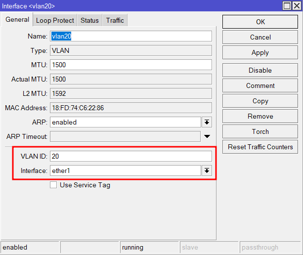 Cuando nos encontramos que el servicio de INTERNET a través de DIGI es mediante una línea alquilada a MOVISTAR (NEBA) utilizará la VLAN20 para este propósito. De modo, que crearemos la subinterfaz con la VLAN20 y la asociaremos al puerto WAN de nuestro Mikrotik, en este caso el ether1: