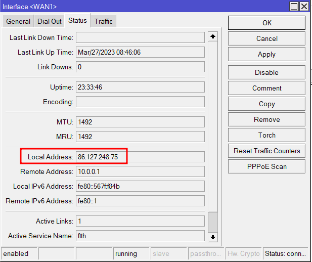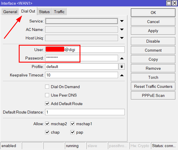 Una vez realizado el paso anterior crearemos la interfaz PPPoE client y la asociaremos a la VLAN20 con los datos que nos ha proporcionado DIGI (Usuario y contraseña) para poder recibir nuestra IP pública (en el caso de que no estemos dentro de un CG-NAT):