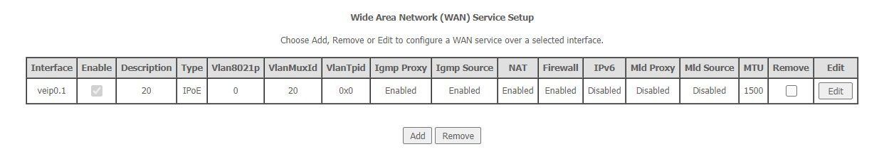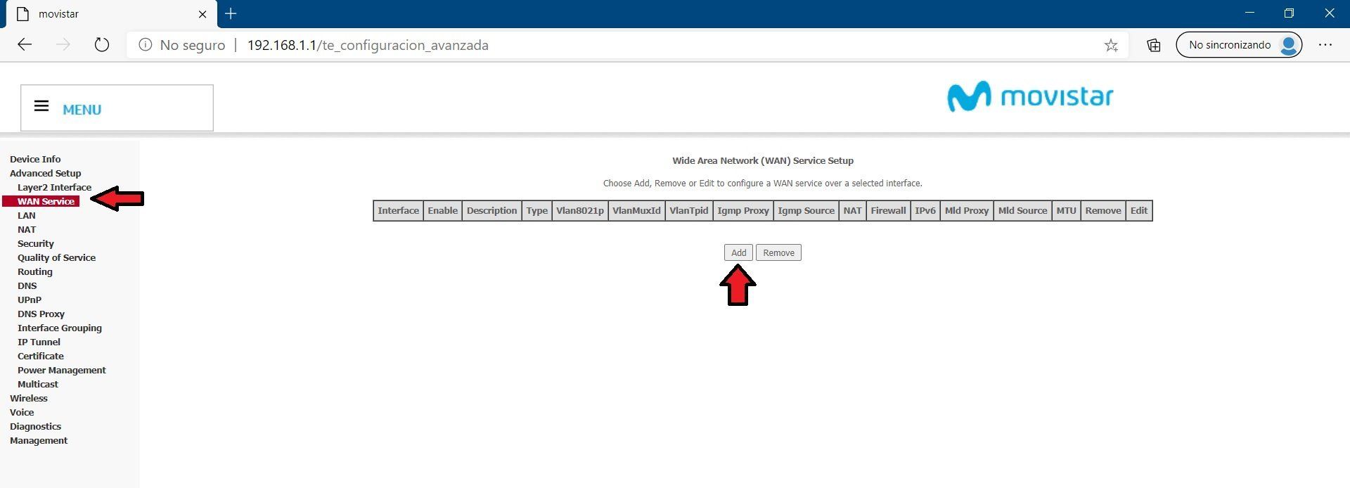 Nos dirigimos al apartado de WAN SERVICE y eliminamos la configuración que hubiera aplicada, seguramente de una línea antigua abonada a la fibra de Movistar