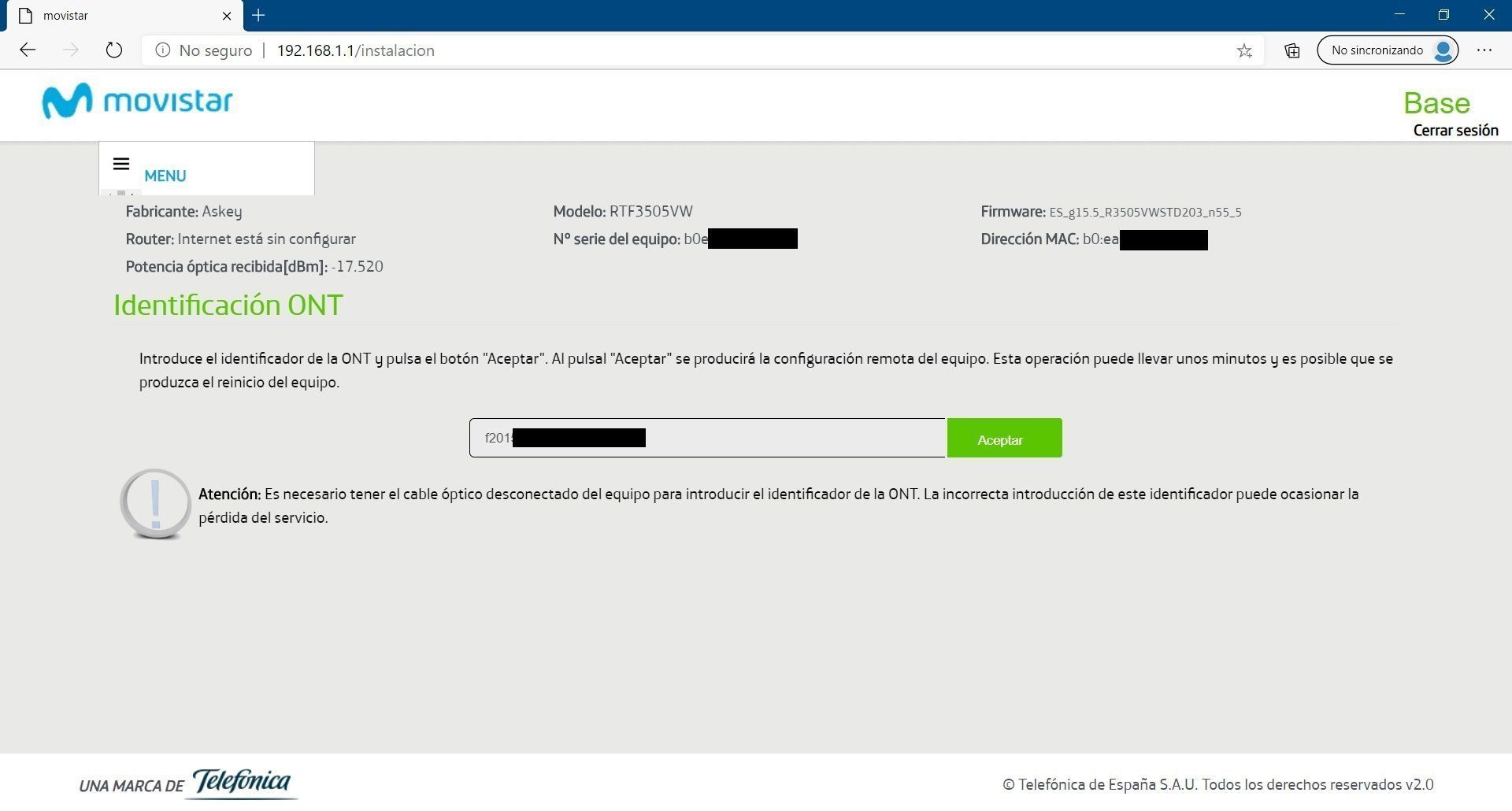 Como comentaba, si ya disponemos del ID ONT lo primero que debemos hacer es introducirlo en el router de Movistar en la siguiente dirección 192.168.1.1/instalacion: