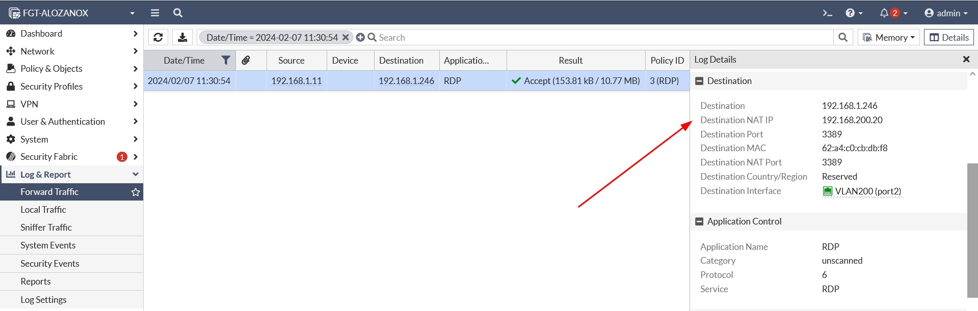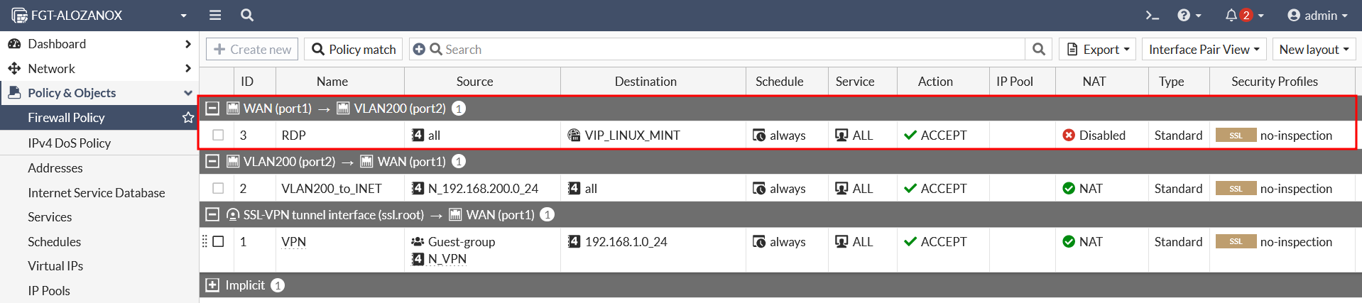 Una vez creada la VIP toca aplicarla a la regla que nos permita acceder a dicho equipo, en este caso, el tráfico viene de la interfaz WAN y sale por la interfaz VLAN200: