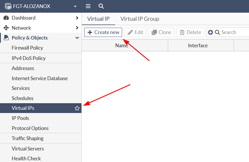 Para configurar una VIP deberemos dirigirnos a la sección «Policy & Objects»>»Virtual IPs»: