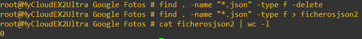 Cuando las he descargado me he encontrado que había miles de ficheros .json que no quería conservar. De modo que para eliminar estos archivos con esta extensión simplemente nos situamos sobre el directorio donde se encuentren las fotos e introducimos el siguiente comando: