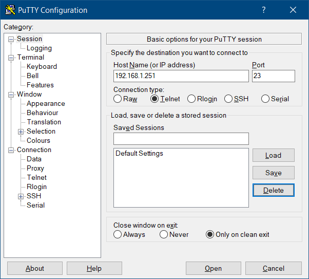 El proceso para extraer el IDONT de la ONT i-240g-t es muy sencillo. Únicamente deberemos conectar nuestro PC al puerto eth1 del conversor y acceder vía telnet (con PuTTY por ejemplo) a la IP que tiene de gestión: 192.168.1.251