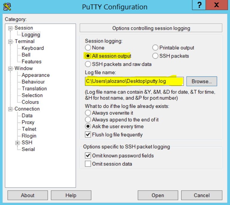 Como la cantidad de información que podemos recopilar en una única sesión puede ser bastante amplía y superar fácilmente esa cifra, podemos almacenar toda esa información en un fichero seleccionando en el subapartado de «Session» > «Logging»: All session output y especificando la ruta donde se guardará el archivo generado.