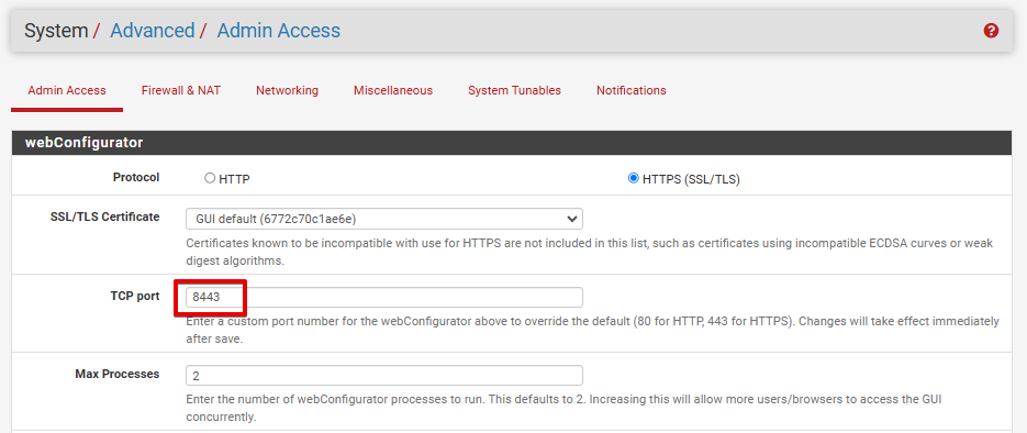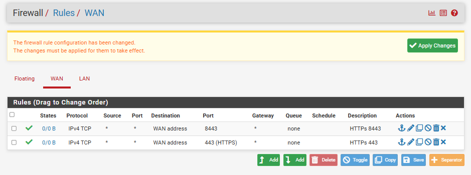 El 8443 lo utilizaremos para la consola de administración de pfSense para securizar el acceso y que no sea accesible desde Internet. No te olvides pulsar en Apply Changes!: