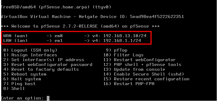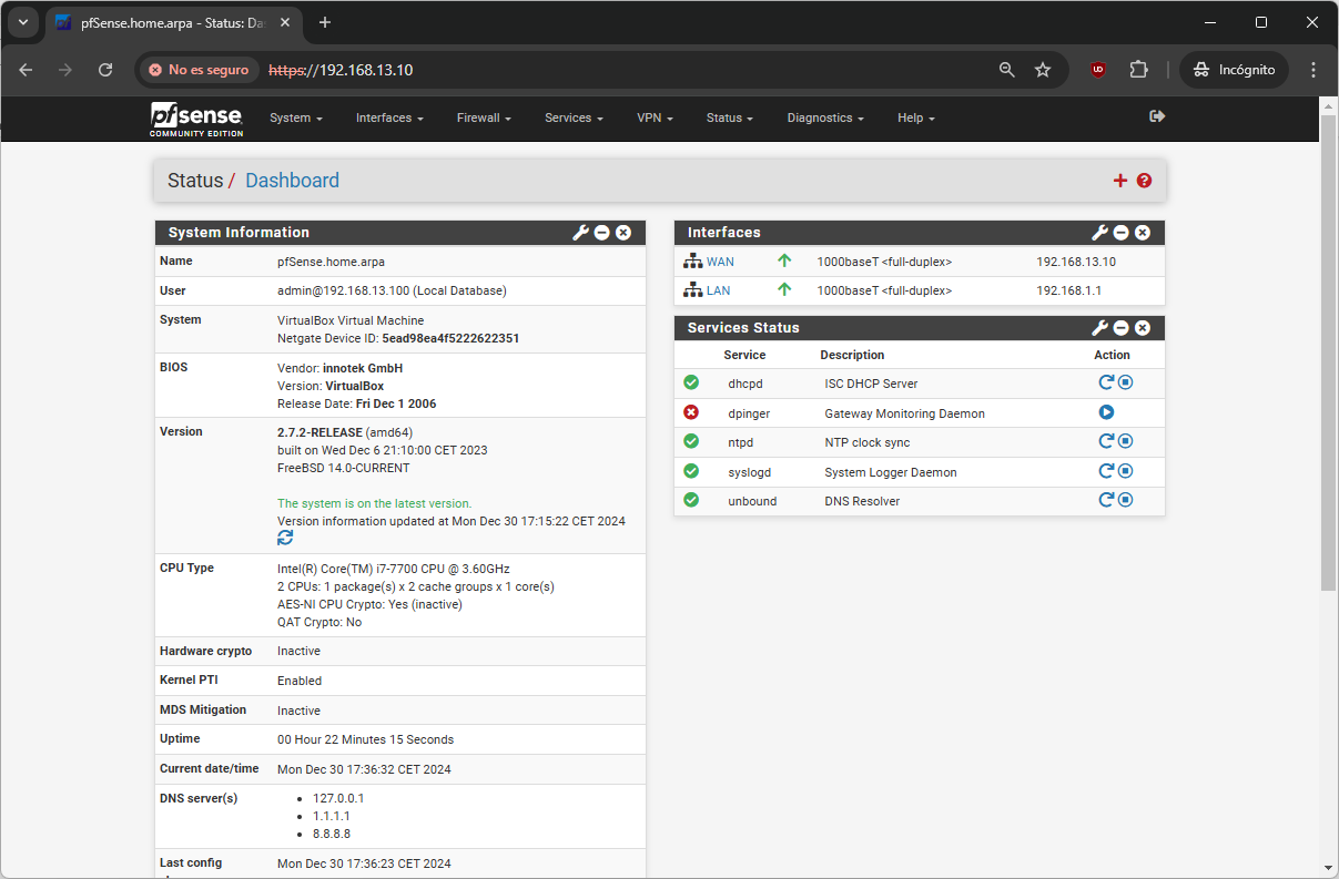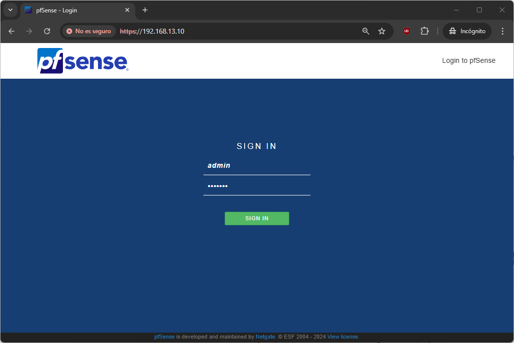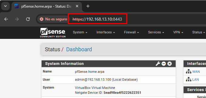 Esto nos permitirá acceder a la consola de administración por el adaptador WAN de pfSense (user:admin / pass:pfsense):