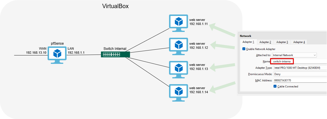 A la hora de crear las vm’s en VirtualBox que albergan los websevers, hay que tener en cuenta que debemos conectarlas al mismo switch virtual interno “switch-interno” para que estén en la LAN del pfSense y puedan tener las IP’s correspondientes del rango 192.168.1.0/24: