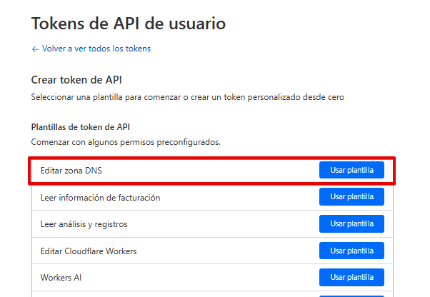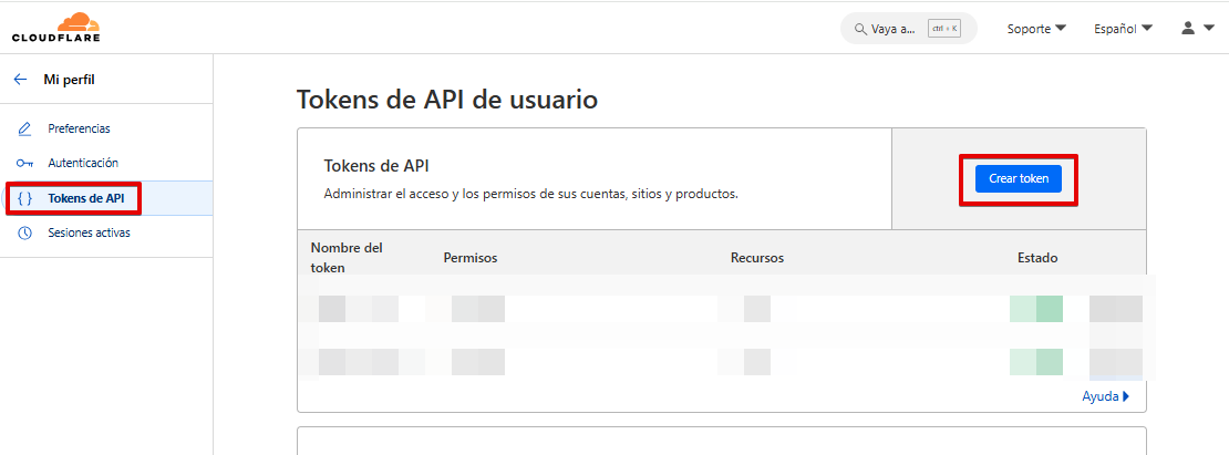 Nos vamos a nuestro perfil de Cloudflare, pulsamos en Tokens API y en Crear Token: