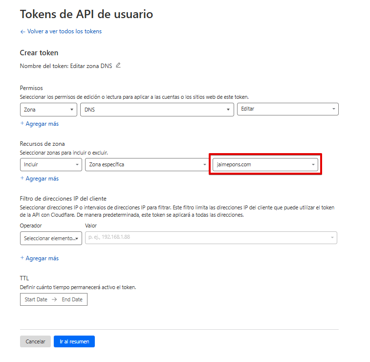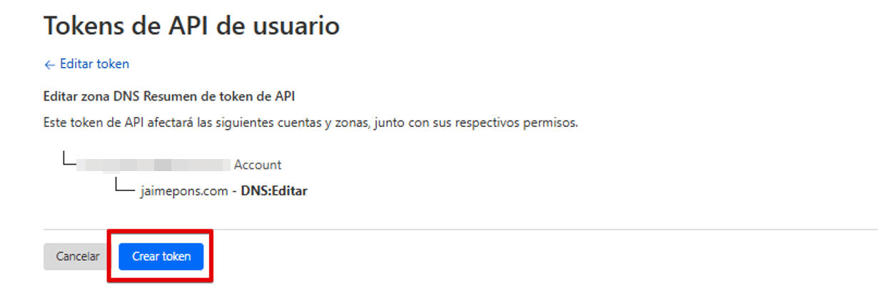 Aunque hay centenares de servicios de DDNS (no-ip, dyndns, etc), dado que utilizamos Cloudflare para gestionar los DNS del dominio jaimepons.com, vamos a utilizar su servicio de DDNS. Para ello, vamos a crear una API key que permita modificar los registros DNS del dominio jaimepons.com.