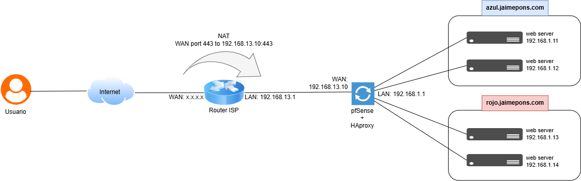- Añadiremos a pfSense un HAproxy como proxy inverso para poder proveer varios servicios internos sin necesidad de tener que abrir tropecientos puertos NAT en el router (bueno, solo abriremos uno, el 443 del SSL)