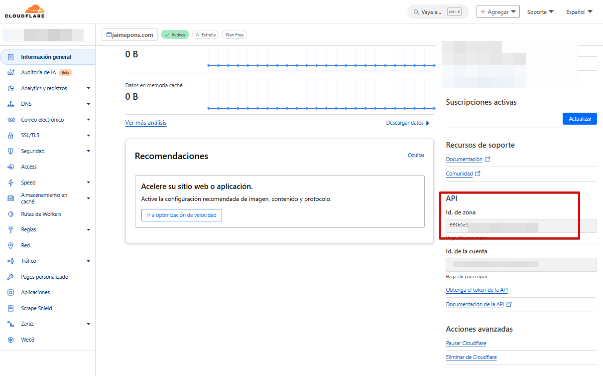 Para utilizar el servicio de DDNS, necesitamos también el Zone ID del dominio. En la consola principal del dominio, podemos verlo: