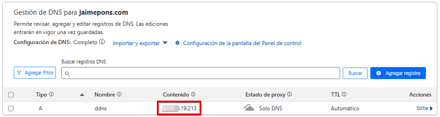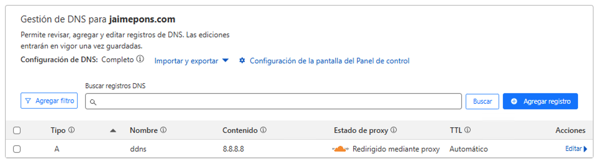 Y en Cloudflare, veremos el registro DNS actualizado: