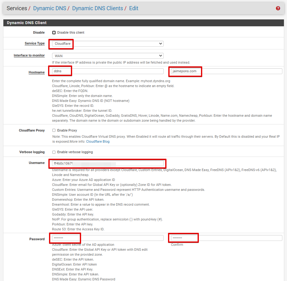 Añadimos un nuevo cliente, seleccionamos Cloudflare, añadimos como hostname el registro “ddns” que hemos creado anteriormente, en dominio escribimos jaimepons.com y ahora la parte interesante: en username, escribimos el Zone ID, y en password el API Token. Rellenamos y guardamos: