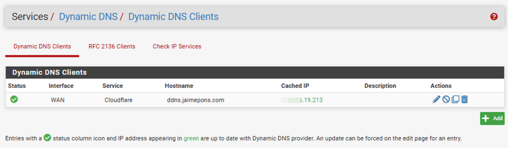 Esta IP inicial nos da igual, porque en el momento que configuremos DDNS en pfSense la IP se actualizará a nuestra IP pública de internet, y así de paso confirmamos que funciona correctamente.