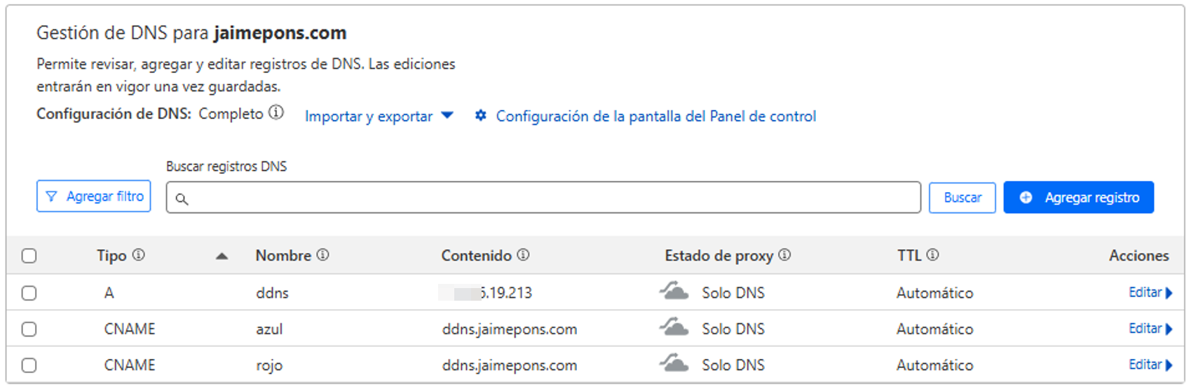 Ahora solo tenemos que ir creando CNAMES de los subdominios que nos interesen y que apunten a ddns.jaimepons.com. Creamos azul y rojo.