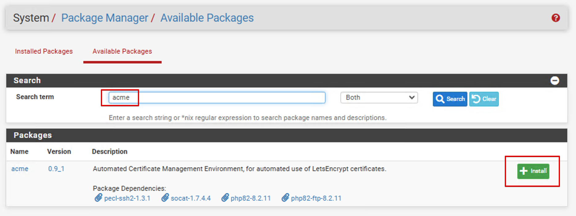 - Instalación y configuración del plugin ACME en pfSense, encargado de solicitar/renovar los certificados SSL en Let’s Encrypt.