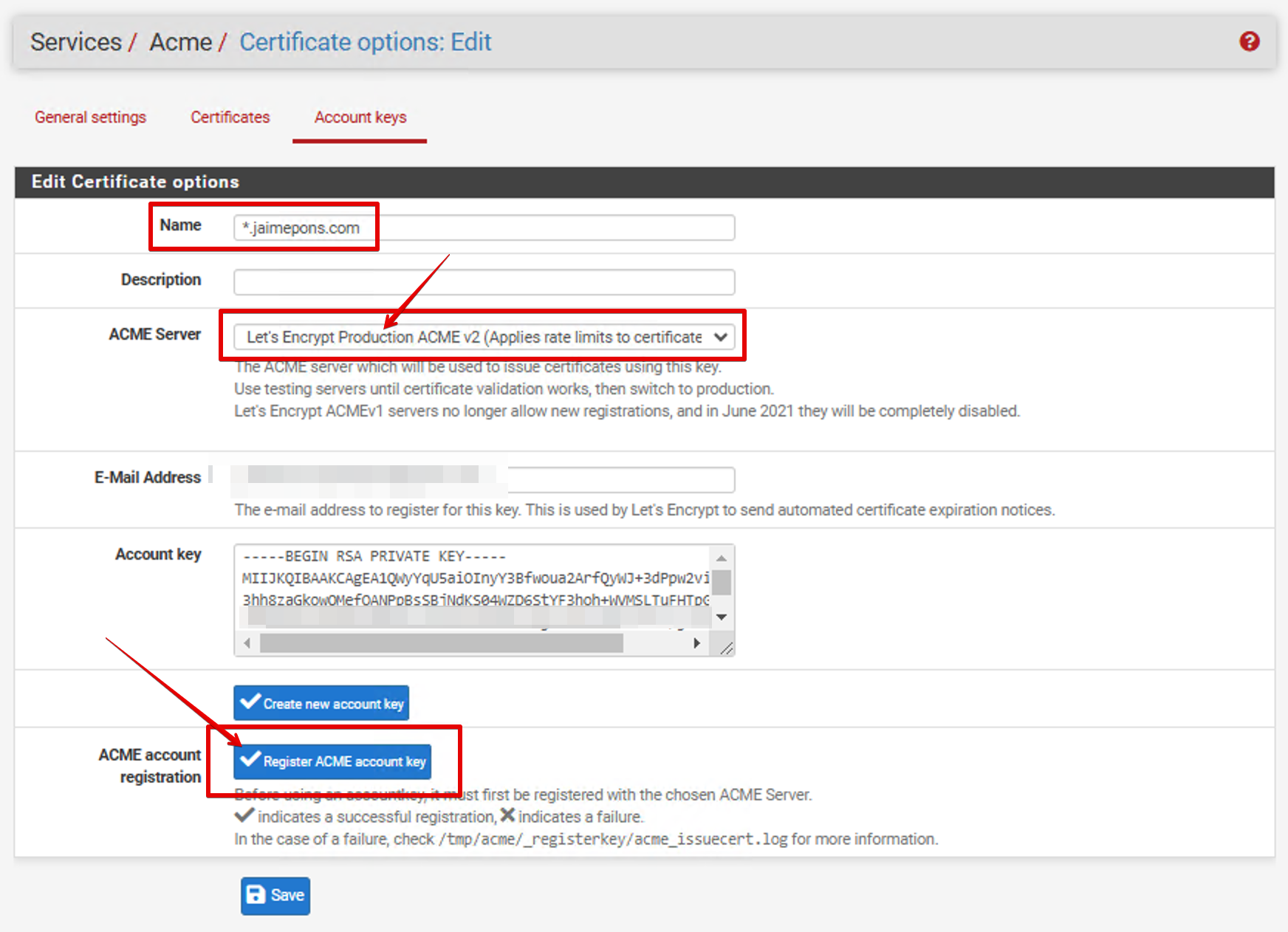 Cuando veas en “Register ACME Account Key” el check de OK en forma de V, pulsa en Save