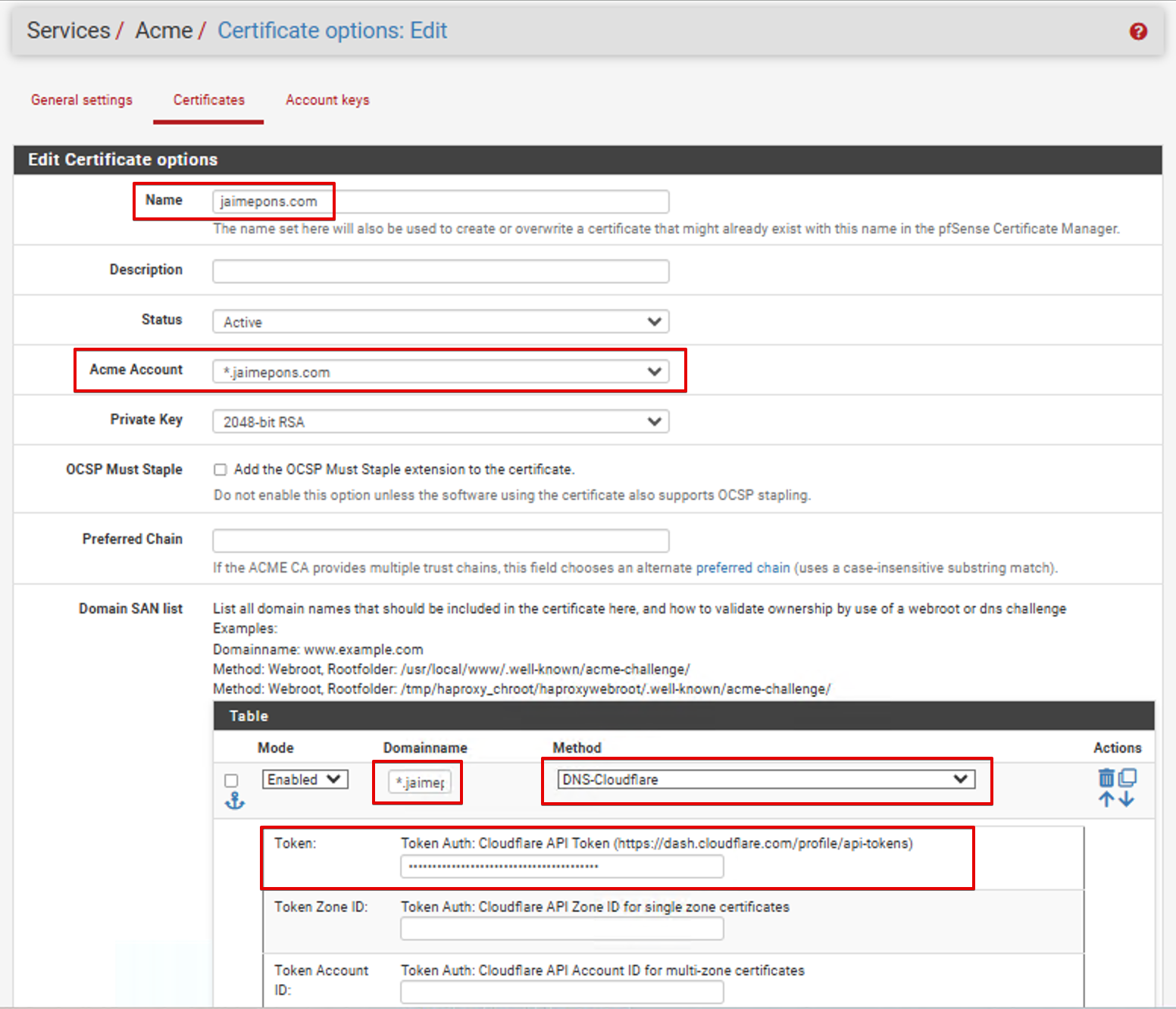 Para ello le ponemos un Name (yo le pongo el mismo dominio para poderlo encontrar fácilmente después), seleccionamos la “Acme Account” que acabamos de crear, en Domain SAN list añadimos *.jaimepons.com para que nos genere un certificado de tipo Wildcard, seleccionamos Cloudflare como proveedor de DNS, y pegamos la API Token que hemos generado en pasos anteriores (¿la habías copiado verdad? ¿verdad?). Por último, pulsamos en Save
