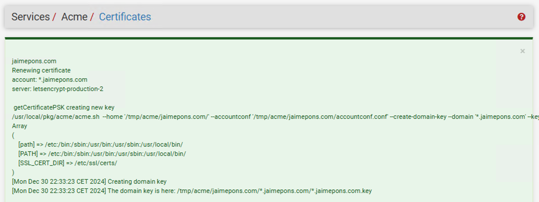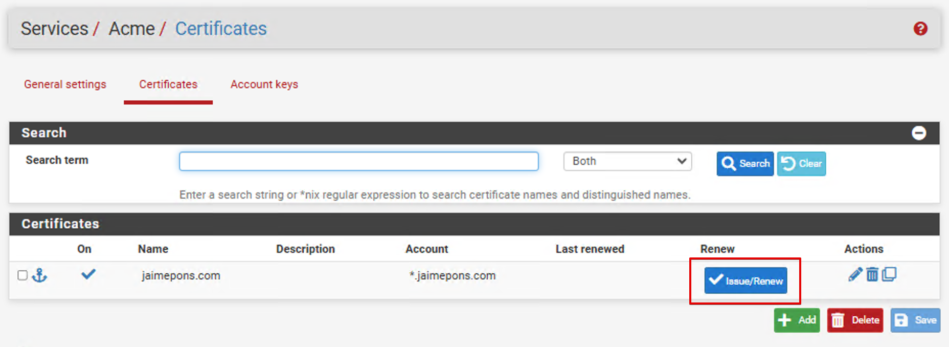 Una vez configurado el domino, pulsamos en “Issue/Renew” para solicitar el primer certificado o renovación del mismo. Esto luego lo automatizaremos y así nos olvidaremos de hacerlo cada 3 meses cuando caduque el certificado.