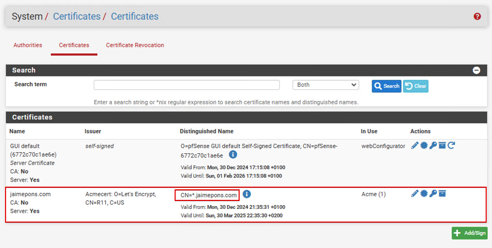 Ahora, si vamos a System > Certificates > Certificates podemos ver que ya lo tenemos disponible en pfSense.