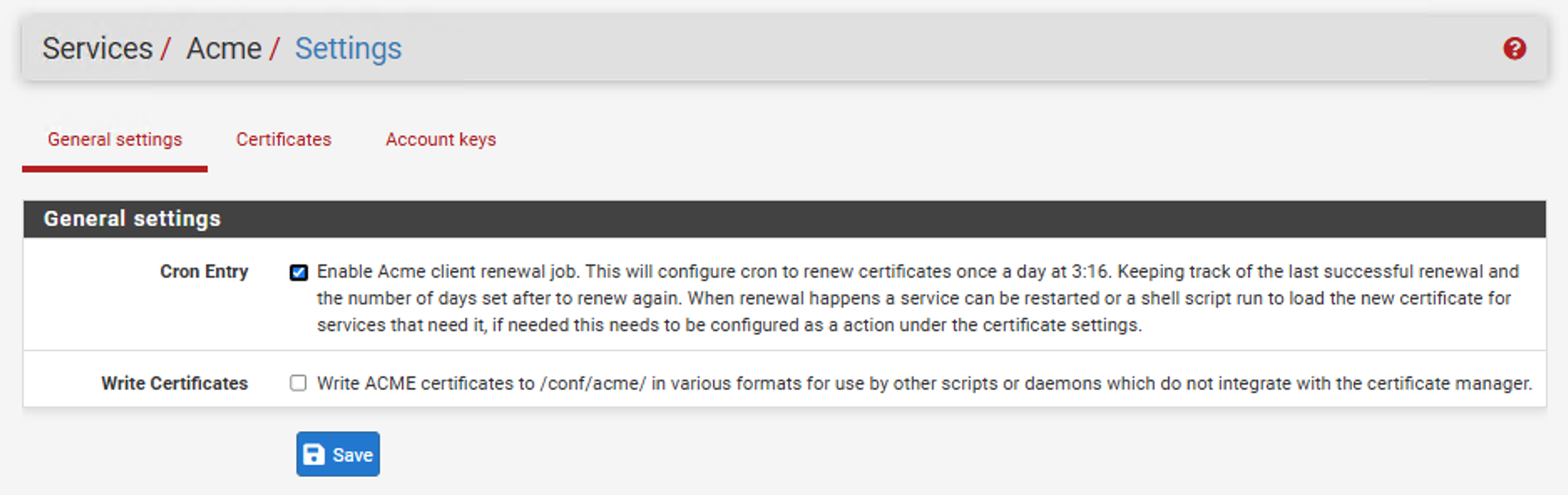 Por último, dentro del plugin de ACME, en el apartado de General Settings, marcaremos la opción de “Cron Entry” para que pfSense renueve el certificado de forma automática: