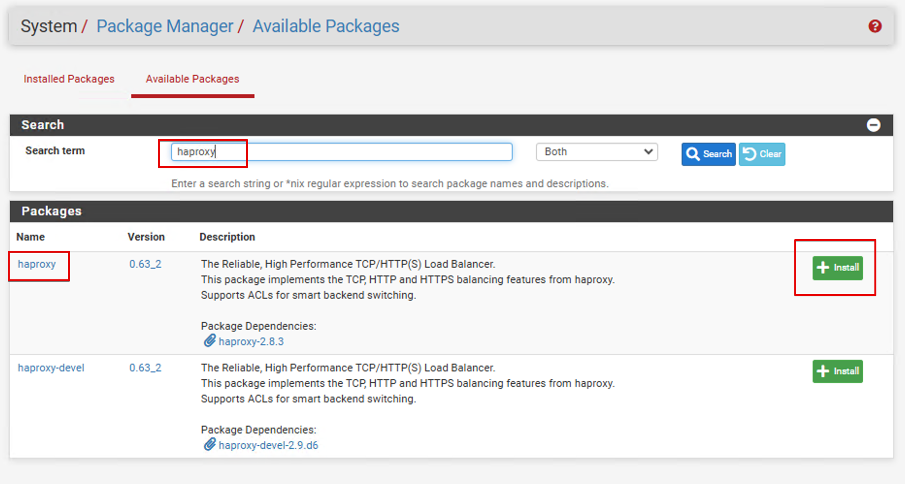 Bueeeeno, por fin! ¡Menudo chorizo hasta llegar aquí! Llegamos al hueso del asunto. Ya tenemos pfSense listo, DDNS funcionando, el certificado Let’s Encrypt instalado y los webservers esperando peticiones. Vamos a por el HAproxy, así que a instalar el plugin: