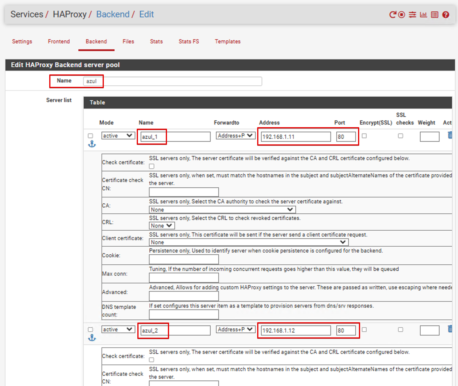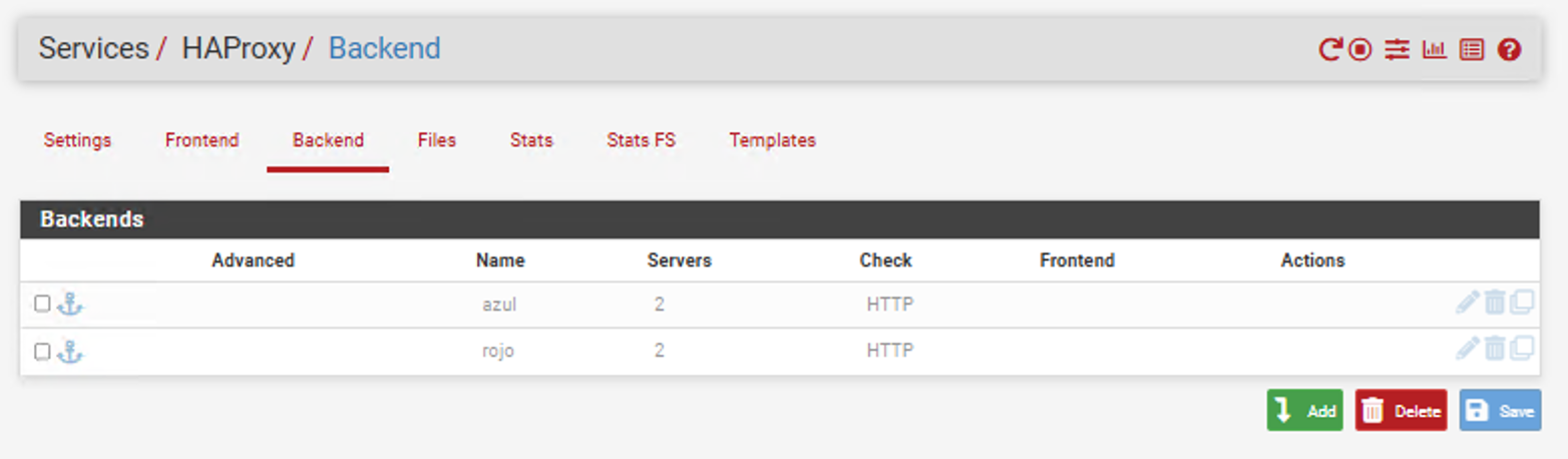 Vamos a la pestaña Backend, creamos uno nuevo y ponemos en nombre algo descriptivo como “azul”, en Server list añadimos los dos servidores que darán servicio: